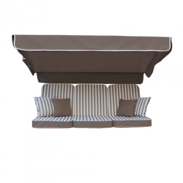Данный сменный комплект предназначен для садовых качелей, предназначен такой комплект для сидения размером 170 см. Размер крыши составляет 200 на 118 см. В комплекте находится матрас, тент, а также четыре подушки. Крыша, матрас, а также валики в этой модели изготавливались из инновационной ткани тексилк. Данная ткань не выгорает на солнце, на ней не появляется плесень, она защищает от ультрафиолетовых лучей. В качестве наполнителя используется поролон, на матрасе есть молния. При необходимости наполнитель, а также чехол стирается.